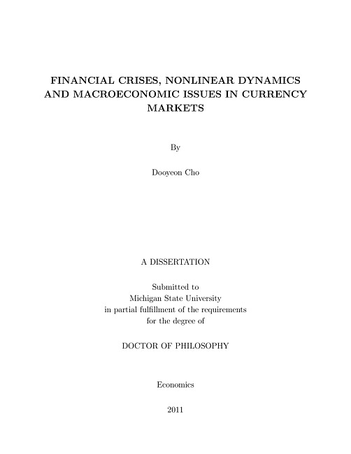 This dissertation consists of three chapters on international financial crises, nonlinear dynamics and macroeconomic issues in currency markets. The first chapter examines the mechanisms behind output drops across a sample of 23 international financial crises. While three generations of models have studied the causes of financial crises, less is known about the mechanisms by which crises lead to output drops. One unresolved question is whether the mechanisms behind output drops are similar across episodes. To address this question, we apply the Business Cycle Accounting (BCA) methodology by Chari et al. (2007) to a sample of crises. While the efficiency wedge is invariably the most important one, the relevance of the labor and investment wedges varies depending on the size of the output drop and the severity of banking problems--as measured by bank closures, nonperforming loans and credit flows. Typically, in cases with smaller output drops and milder banking crises, the labor wedge tends to be more important than the investment wedge. The opposite is true in cases, such as those in East Asia in 1997/98, with larger output drops and severe banking problems.The second chapter explores the interaction between exchange rate volatility and fundamentals by examining the role of trade intensity in the reversion of exchange rates to long-run equilibrium values. While exchange rates remain mostly unpredictable, researchers have been able to link currency fluctuations to some fundamentals such as interest rates, Taylor rule fundamentals, and relative PPP. In an effort to add to this literature, in this paper we present evidence of a link between trade intensity and exchange rate dynamics. We first establish a negative effect of trade intensity on exchange rate volatility via panel regressions using distance as an instrument to correct for endogeneity. We also run a nonlinear model of mean reversion to compute half-lives of deviations of bilateral exchange rates from relative PPP, and find these half-lives to be significantly lower for high trade intensity currency pairs. This finding does not appear to be driven by Central Bank intervention. In an application, we show that our findings can be used to improve the performance of currency trading strategies, by allowing the thresholds beyond which a currency is considered overvalued to depend on trade intensity.The last chapter provides an extensive analysis for both nonlinear and long memory characteristics as well as mean reverting behavior of real exchange rates. This paper estimates a fractionally integrated, nonlinear autoregressive ESTAR (FI-NLAR-ESTAR) model for strongly dependent processes developed by Baillie and Kapetanios (2008). While the linear fractionally integrated model appears to fail to detect mean reversion in real exchange rates, the nonlinear long memory model is found to be more supportive of significant empirical evidence for the presence of slow mean reversion in real exchange rates for all of the currencies considered in this study over the recent float. The results suggest that a model that is capable of representing both nonlinear and long memory characteristics may help identifying mean reversion in real exchange rates.