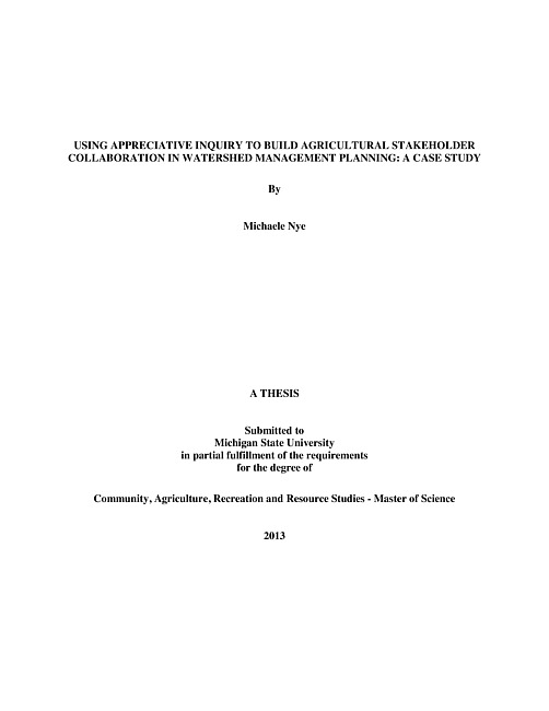 Watershed management aims to address nonpoint source pollution, which results from a variety of land management practices. Currently, agriculture is cited as one major source of nonpoint source pollution. We need a better understanding of how to collaborate with stakeholders when their involvement is important, such as the case in watershed management. We used a case study in the Red Cedar River Watershed to attempt and evaluate one method of building collaboration among agricultural stakeholders in the watershed management planning process. Watershed management and public participation literature informed the selection of the Appreciative Inquiry Model to frame meetings with agricultural stakeholders designed to build collaboration. An analytical framework was used to guide the collection and analysis of evidence to determine whether or not desired project outcomes were met using Appreciative Inquiry and whether or not the application of Appreciative Inquiry could be considered an egalitarian deliberation form of public participation. The study found the Appreciative Inquiry Model can be applied in scenarios where the egalitarian deliberation perspective is most beneficial for stakeholder involvement. The study also found that using the Appreciative Inquiry Model allowed for achieving some of the desired process and substantive outcomes of the Watershed Management Planning Project. The use of Appreciative Inquiry did not achieve the desired stakeholder attendance. All outcomes resulting from this approach for building stakeholder collaboration cannot be measured at this time.