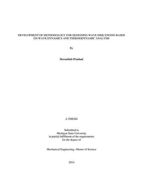 AbstractWave rotor technology is based on pressure wave compression and expansion wave scavenging in a compressible fluid. This can be used to realize compression and exhaust strokes of an IC engine in a rotating disk, power extraction is governed by turbo-machinery principle and constant volume combustion is achieved which makes the wave disk engine a highly fuel efficient devise for power extraction. Wave disk engine primarily consists of a rotor mounted in housing with inlet and outlet ports carved to implement given port timings. As the rotor revolves each channel outlet faces the housing wall for a fraction of revolution until it gets exposed to the outlet port opening in the housing. At high rpm this event is equivalent to sudden opening of valve in a channel filled with pressurized gases, which generates expansion waves. The gases coming out impart angular momentum to the rotor generating power very similar to a reaction turbine operation.As the rotor passes the opening port it faces the housing wall, this event is equivalent to sudden closing of valve which generates hammer shock compressing the air-fuel mixture. When both the ports are closed the spark ignition initiates constant volume combustion resulting in a pressure gain combustion which provides better fuel efficiency.The design principle of wave disk engine demands research in wave propagation in gases in a variable area channel and understanding of work done by unsteady flow of gases. Therefore this work focuses on understanding of wave dynamics in a variable area duct, generating corresponding thermodynamic process diagrams and estimating thermodynamic efficiency of overall cycle. Port timing is most crucial design parameter to realize the benefits of constant volume combustion and a design approach is developed to determine port timings for a given shape of channel by running numerical simulations and constructing cycle diagrams. Three different rotor shapes are analyzed using this approach and an optimized channel shape is suggested.