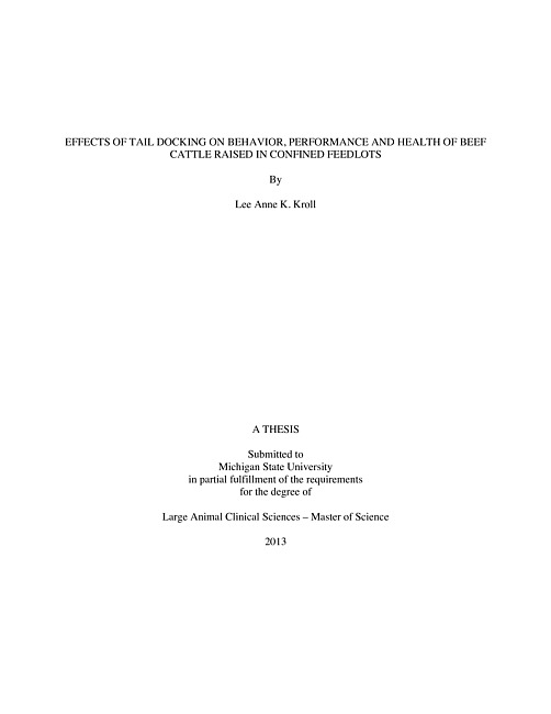 ABSTRACTEFFECTS OF TAIL DOCKING ON BEHAVIOR, PERFORMANCE AND HEALTH OF BEEF CATTLE RAISED IN CONFINED FEEDLOTSByLee Anne K. KrollTail docking of feedlot cattle is a management practice used in some confined, slatted floor feedlots of the Midwestern United States. Justification for tail docking is to reduce tail injuries and their sequelae, and improve performance. Limited evidence exists to support these claims and the practice of routine tail docking is an animal welfare concern in regards to pain and loss of the tail for communication and fly avoidance. The primary objective of the research conducted for this thesis was to determine the effect of routine tail docking on performance and health parameters of feedlot cattle housed in a confined slatted floor feedlot facility and behavioral response following tail docking. Cattle were randomly assigned to 1 of 2 treatment groups; docked (DK) or control (CN). All calves received the same pre- and post-operative analgesia and DK calves had the distal two-thirds of their tail removed with pruning shears. For all performance trials, we found no significant effect of treatment on performance, carcass, morbidity, mortality or lameness. Tail injuries were present among 60-76% of cattle that were not tail docked. Behavior studies demonstrated increased fly avoidance activity and signs of acute pain in DK calves. We were unable to identify a performance or health advantage to tail docking, and we observed signs of compromised welfare in feedlot cattle following tail docking. However, tail tip injuries persisted in cattle raised in slatted floor facilities. Because routine tail docking of cattle housed in confined, slatted floor facilities does not appear to improve performance and cattle welfare is compromised, alternative solutions to reduce the incidence of tail tip injury should be considered.