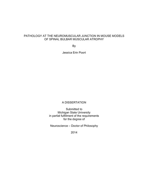 Spinal bulbar muscular atrophy (SBMA) is a progressive, late onset neuromuscular disease that results in muscle weakness and atrophy, as well as motoneuron death in men. While pathology at the neuromuscular junction (NMJ) is noted in numerous neurodegenerative diseases, disease-related changes at the NMJ in SBMA have not been explored. Characterizing such changes is not only important for determining whether the NMJ has any role in the functional changes underlying motor dysfunction, but also in determining how such potential pathology at the NMJ develops as disease progresses. If for example, pathology emerges first at the NMJ followed by motoneuron death, then the NMJ offers future promise as a therapeutic target for preventing or reversing symptoms of SBMA before motoneurons are lost. We evaluated three different mouse models of SBMA, one overexpressing a wildtype androgen receptor (AR) exclusively in muscle fibers (so called "myogenic" model), a second which expressed the endogenous AR gene with the first exon of the human mutant AR gene "knocked in" (the so called "knock-in" model), and a final model that broadly expresses a full length human AR transgene harboring the SBMA mutation (the so called "97Q" model). Using both confocal microscopy and electron microscopy, I found that all three mouse models show a pathological fragmentation of the NMJ suggestive of functionally weakened synapses. Other changes at the neuromuscular synapse suggesting decreases in synaptic strength that were found in some but not all models include a decline in the number of docked vesicles ready for release in nerve terminals, a widening of synaptic clefts, simplified postsynaptic folds, and an abnormal accumulation of synaptic vesicle and neurofilament proteins. Retrograde axonal transport of endosomes was also characterized in the 97Q model using live imaging confocal microscopy. Despite previously published data, I found no evidence for a disease-related defect in retrograde transport in the 97Q model. The strikingly abnormal morphology of NMJs in all three models raises the possibility that synaptic function is impaired. Such synaptic dysfunction may contribute to or underlie the impairments in motor function associated with SBMA.