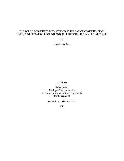 Past studies and reviews on the role of Computer Mediated Communication (CMC) mediums on unique information pooling and decision quality in virtual teams has largely been inconsistent and, at times, contradictory. In this study I argue that the inconsistency in past findings is due to a flawed interpretation of CMCs as being equivalent forms of communication, when they should instead be viewed as distinct mediums varying in media richness. In this study I present a new model of decision-making whereby the media richness of the CMC being used and the team’s level of CMC competence will predict decision quality through unique information pooling. Results indicated that there were significant differences in unique information pooled between high and low media richness conditions, with teams in the high media richness condition pooling significantly more unique information. However, team CMC competence was not found to predict unique information pooling, and unique information pooling was not found to predict decision quality.
