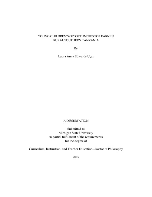 Young children’s opportunities to learn are complex and multifaceted. Opportunities for young children to learn in Tanzania vary widely. Within the NGO and scholarly communities focused on early childhood initiatives in Tanzania, there is an appeal for descriptive information to better understand the opportunities to learn for young children in specific contexts. There are limited studies that examine and seek to address an understanding of what opportunities exist for young children to learn in rural Tanzania.My study is a response to this appeal and presents a focused ethnography of young children’s opportunities to learn in rural southern Tanzania. I designed the focus of my study to explore and develop a detailed description to examine the sociocultural contexts and opportunities to learn for young children in the village of Ndogo and its surrounding villages.This study collected data addressing the following questions: What are opportunities to learn for young children in informal and formal contexts in the home, the community, and the Ndogo school? Where, how, and with whom are these opportunities to learn? I collected this data through semi-structured interviews, participant observations, and focus groups conducted with students, teachers, parents, and village members. I also examine influences on these opportunities from outside the community including from the national government and international donor organizations. The findings of my study examine the multiple and diverse opportunities for young children to learn in a variety of modalities. The complex issue of languages is addressed with divergent opportunities between the home, the community and the school. I examine the sociocultural aspects of these opportunities for young children to learn.This study adds to the literature that addresses the nuances, ambiguities, and complexities of the opportunities for young children to learn in and out of formal school in a specific context. These complex descriptions of young children’s opportunities to learn could provide data for future research as well as provide additional information to contribute to and inform decision-making by NGO and government initiatives in Tanzania concentrated on early childhood education and development.