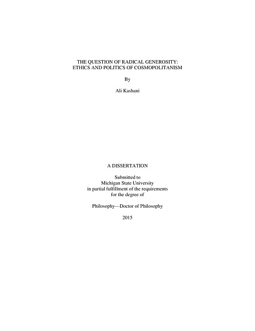 ABSTRACTTHE QUESTION OF RADICAL GENEROSITY: ETHICS AND POLITICS OF COSMOPOLITANISMByAli KashaniThis inquiry is about the following question: what conditions give rise to the possibility of cosmopolitanism. This study examines ethical and political conditions concerning cosmopolitanism, and argues that radical generosity is a key condition for the possibility of cosmopolitanism. Generosity involves benevolence that expects nothing in return. It does not depend on reciprocity, duty, calculation, or following a rule. It is an unconditional practice. Radical generosity differs from random acts of generosity that may happen from time to time, but do not have profound social and political impact. Radical generosity is a social practice, which has the potential to transform ethical and political practices. The practice of radical generosity has a transformative aspect, that is to say, it is a practice as a “way of life.” A “way of life” means practicing radical generosity as an everyday activity, which can become the ethos of society. In other words, radical generosity has the potential to challenge and transform existing values and norms. This study examines three distinct philosophical approaches to the possibility of cosmopolitanism. It examines cosmopolitanism as a “way of life” developed by Stoics thinkers in diverse ways, but lacking a political or institutional conception of cosmopolitanism. Then, examines two other approaches to cosmopolitanism, the “juridical-political”(Kant and Habermas) in the framework of political institutions, and the “beyond-normative”(Derrida and Levinas) in the realm of unconditional ethical responsibility. It acknowledges the importance and necessity of these approaches to cosmopolitanism and extracts certain ideas from these thinkers. It also problematizes and shows their limitations in certain respects in order to advance its argument. Finally, it attempts to develop a conception of radical generosity as a social practice in concrete terms, and underscore the idea of practice (praxis). The idea of practice (praxis) refers to human activities that transform material, social, and political conditions in historical terms. It attempts to show the relevance and importance of radical generosity as a key condition for the possibility of cosmopolitanism.