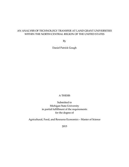 ABSTRACTAN ANALYSIS OF TECHNOLOGY TRANSFER AT LAND GRANT UNIVERSITIES WITHIN THE NORTH CENTRAL REGION OF THE UNITED STATESByDaniel Patrick GoughTechnology transfer has become an increasing form of knowledge dissemination used by colleges and universities in the United States and around the world. Since the passage of the Bayh-Dole act in 1980, research institutions have used technology transfer to add value to research discoveries, bring knowledge into the market place, and as a tool to generate revenue for research, the technology transfer office, the inventor, the inventor’s unit, and for general administrative functions. As these institutions continue to increase their efforts to effect economic development through patents, licenses, start-ups, and other like agreements, it is important to understand what drives these outputs and how universities can more effectively transfer technology. This research gathered data to analyze the drivers of the technology transfer process among eleven public, land-grant, research universities located within the North Central region of the United States. We find that research disclosures from faculty inventors are a significant initial input into the technology transfer process. We also find that universities with more full-time employees dedicated to technology transfer are more likely to generate more licensing revenue and patents than those with fewer employees. Additionally, we find that revenue sharing policies have a negative, but quite small, impact on technology disclosures. In order to better understand what drives faculty to disclose research discoveries, more research needs to be done on the true impact of revenue sharing policies for faculty inventors.