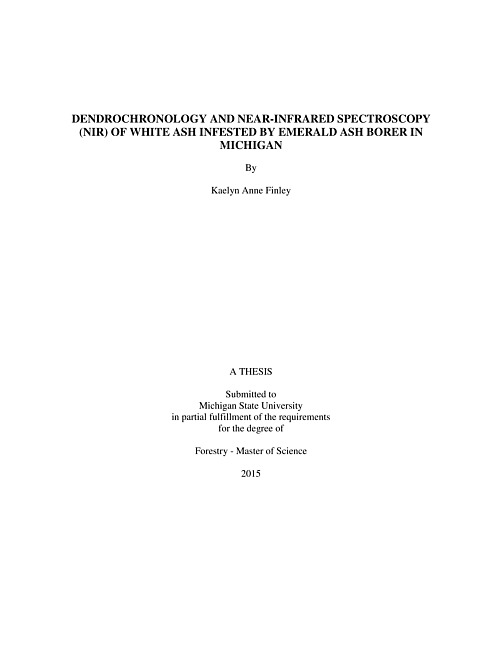 ABSTRACTDENDROCHRONOLOGY AND NEAR-INFRARED SPECTROSCOPY (NIR) OF WHITE ASH INFESTED BY EMERALD ASH BORER IN MICHIGANByKaelyn Anne FinleyEmerald ash borer (EAB) (Agrilus planipennis Fairmaire), is a non-native beetle responsible for widespread mortality of several North American ash species (Fraxinus sp.). Current non-destructive methods for early detection of EAB in specific trees are limited, which restricts the effectiveness of management efforts. This study explored the potential of dendrochronology and near-infrared spectroscopy (NIR) as novel methods for detection of EAB on white ash (Fraxinus americana) in Michigan using a handheld increment borer. Increment borers are used to non-destructively and efficiently collect increment cores from trees. While the potential of dendrochronology for early detection of EAB in Michigan was inconclusive based on the results of this study, white ash in Michigan was shown to have a strong negative relationship with precipitation and available moisture in the summer of the previous year. Increased risk of branch failure due to EAB infestation may further increase ash susceptibility to wind damage. Near-infrared spectroscopy was successfully used to discriminate between bark, phloem and xylem tissues from EAB infested and visually healthy trees using linear discriminant analysis. The xylem spectra transformed using a Savitzky-Golay, 1st derivative smoothing filter over the full NIR wavelength range observed in this study (1134-2190 nm) had the highest discriminating power at 97% correct classification accuracy.