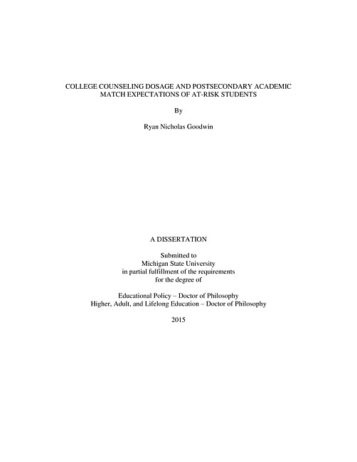 In U.S. public high schools, school counselors are tasked with assisting students and their families in the college-going process. This support includes building student college expectations and helping students search for, apply to, and enroll in postsecondary institutions. Even with this formal support, students, particularly those most at-risk, hold lower postsecondary expectations, matriculate to, and persist through higher education in disproportionately low rates. Moreover, when these students do matriculate, they often do so at institutions with less selective enrollment criteria than their academic credentials suggest they would be successful, a phenomenon known as academic undermatch. Using a mixed methods approach, this study seeks to understand how college counseling dosage, as administered primarily by school counselors, influences student postsecondary academic match expectations. Further, this study explores school counselor responsibilities and college counseling beliefs in high-need schools to better understand the context of their college counseling efforts.