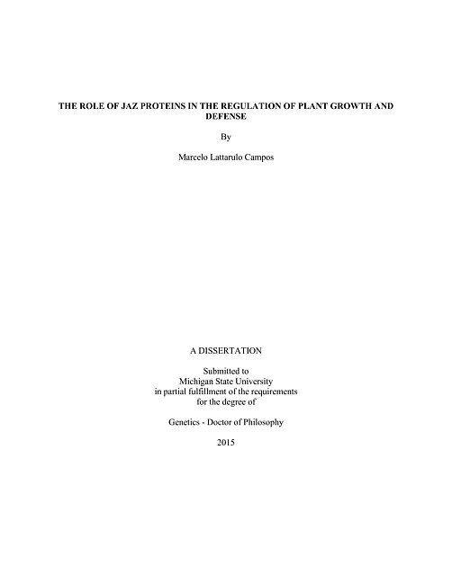 When challenged with environmental stress, plants devote a significant proportion of their biosynthetic capacity to the production of secondary metabolites and other defense-related strategies. Increased production of defensive compounds is associated with diversion of resources (e.g., carbon) from primary growth, thereby limiting plant biomass accretion. This growth-defense antagonism has a profound impact on plant biology and ecological relationships. However, the molecular mechanisms controlling tradeoffs between growth and defense are still poorly understood. The plant signaling molecule jasmonate (JA) is a key regulator of resource allocation as it reprograms transcriptional networks that appear to redirect resources from primary metabolism and growth to secondary metabolism and defense. This molecular “switch” is mediated in part by JAZ repressor proteins that, in the absence of JA, bind to and inhibit the action of JA-related transcription factors (TFs). Stress-induced production of JA promotes the formation of COI1-JAZ co-receptor complexes that targets JAZ proteins for rapid destruction by the E3 ubiquitin ligase SCFCOI1, thereby releasing TFs from inhibition. Here, I use two approaches to show that JAZ proteins have a major role in balancing resource allocation between growth and defense in the model plant Arabidopsis thaliana. First, I demonstrate that alternative splice variants of JAZ10 that are stable in the presence of high levels of JA function to attenuate JA responses, thereby prioritizing growth over defense. Second, I developed a jaz quintuple mutant (jazQ) that lacks five of the 13 JAZ genes and show that this mutant constitutively produces defense compounds but grows slowly. The jazQ mutant was then employed as the parental line in a genetic suppressor screen aimed at uncoupling the growth-defense antagonism. Characterization of one suppressor mutant showed that loss of function of the red light receptor phytochrome B (phyB) rescues the slow growth of jazQ without significantly affecting defense traits. These findings suggest that growth-defense antagonism may not be dictated by limited metabolic resources but rather by hard-wired transcriptional programs that exert control over resource partitioning in dynamic environments. In the long term, the findings described in this dissertation may inform efforts to increase food production and security while reducing the use of pesticides that are detrimental to the environment and human health.