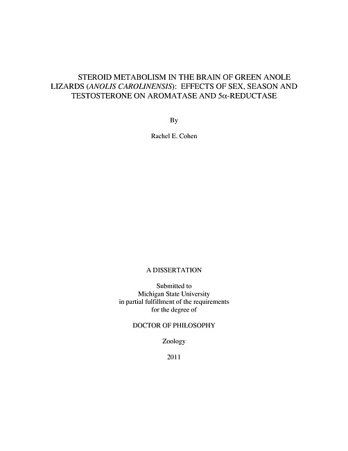 Steroid hormones are critical for proper brain development, as well as the expression of sexual behaviors in adulthood. In the brain, testosterone (T) can be metabolized into estradiol via the action of the aromatase enzyme, or 5α-dihydrotestosterone via the action of the 5α-reductase (5αR) enzyme. Aromatase and 5αR are critical for sexual behaviors in a variety of species, including the green anole lizard. In this dissertation, I began to evaluate the hypothesis that T regulates its own metabolism in the brain of green anoles. I tested this idea using two types of experiments: comparisons across groups of animals under naturally varying T levels and gonadectomized animals with or without hormone replacement. In Chapter 1, I examined the whole brain activity of aromatase and 5αR in gonadectomized males and females that were treated with either a T- or blank-capsule. In Chapters 2 and 3, I cloned the anole-specific aromatase and both isozymes of 5αR (5αR1 and 5αR2) and examined their expression in the brain. In Chapter 4, I described the expression of aromatase and 5αR2 in the forebrain of gonadectomized males and females that were treated with either a blank or T-filled capsule. Finally, in Chapter 5, I examined aromatase, 5αR1, and 5αR2 expression at two different stages in development. This body of work has expanded knowledge on steroid metabolizing enzymes to a reptilian species, and begun to address the idea that T can influence its own metabolism in multiple vertebrate taxa.