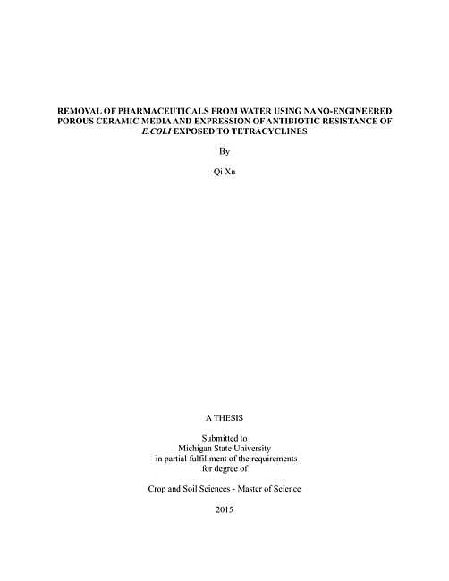 Removal of pharmaceuticals from water using nano-engineered porous ceramic media and expression of antibiotic resistance of E.coli exposed to tetracyclines