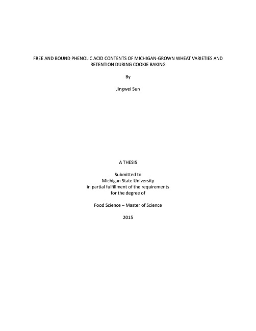 "Plant phenolic compounds have seen increased interest within the field of cereal science in the recent decade, indicated by the ongoing research in their functional and health properties. The objectives of this thesis were (1) to quantify the total phenolic acid and ferulic acid contents of selected Michigan grown wheat varieties harvested in 2013 and 2014, and (2) to compare differences in post-processing antioxidant retention and baking properties between cookies fortified with flour using four different antioxidant formulations (20% bran, 4.4% insoluble arabinoxylan powder, ferulic acid powder, or 20% digested bran with ferulic acid powder)." -- Abstract.