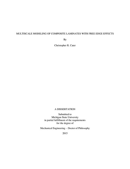 ABSTRACTMULTISCALE MODELING OF COMPOSITE LAMINATES WITH FREE EDGE EFFECTSByChristopher R. CaterComposite materials are complex structures comprised of several length scales. In composite laminates, the mechanical and thermal property mismatch between plies of varying orientations results in stress gradients at the free edges of the composites. These free edge stresses can cause initial micro-cracking during manufacture, and are a significant driver of delamination failure. While the phenomenon of free edge stresses have been studied extensively at the lamina level, less attention has been focused on the influence of the microstructure on initial cracking and development of progressive damage as a consequence of free edge stresses. This work aimed at revisiting the laminate free edge problem by developing a multiscale approach to investigate the effect of the interlaminar microstructure on free edge cracking. First, a semi-concurrent multiscale modelling approach was developed within the commercial finite element software ABAQUS. An energetically consistent method for implementing free edge boundary conditions within a Computational Homogenization scheme was proposed to allow for micro-scale free edge analysis. The multiscale approach was demonstrated in 2D tests cases for randomly spaced representative volume elements of unidirectional lamina under tensile loading. Second, a 3D multiscale analysis of a [25N/-25N/90N]S composite laminate, known for its vulnerability to free edge cracking, was performed using a two-scale approach: the meso-scale model captured the lamina stacking sequence and laminate loading conditions (mechanical and thermal) and the micro-scale model predicted the local matrix level stresses at the free edge. A one-way coupling between the meso- and micro-scales was enforced through a strain based localization rule, mapping meso-scale strains into displacement boundary conditions onto the micro-scale finite element model. The multiscale analysis procedure was used to investigate the local interlaminar microstructure. The results found that a matrix rich interlaminar interface exhibited the highest free edge stresses in the matrix constituent during thermal cooldown. The results from these investigations assisted in understanding the tendency for pre-cracks during manufacture to occur at ply boundaries at the free edge and the preferential orientation to the ply interfaces. Additionally, analysis of various 90/90 ply interfaces in the thicker N=3 laminate found that the free edge stresses were far more sensitive to the local interlaminar microstructure than the meso-scale stress/strain free edge gradients. The multiscale analysis helped explain the relative insensitivity of free edge pre-cracks to progressive damage during extensional loading observed in experiments. Lastly, the multiscale analysis was extended to the interface between the -25 and 90 degree plies in the [25N/-25N/90N]S laminate. A micro-model representing the dissimilar ply interface was developed, and the homogenized properties through linear perturbation steps were used to update the meso-scale analysis to model the interlaminar region as a unique material. The analysis of micro-scale free edge stresses found that significant matrix stresses only occurred at the fiber/matrix boundary at the 90 degree fibers. The highest stresses were located near the matrix rich interface for both thermal and mechanical loading conditions. The highest matrix stresses in the case of extensional loading of the laminate, however, were found at the interior of the micro-model dissimilar ply micro-model within the -25 degree fibers.