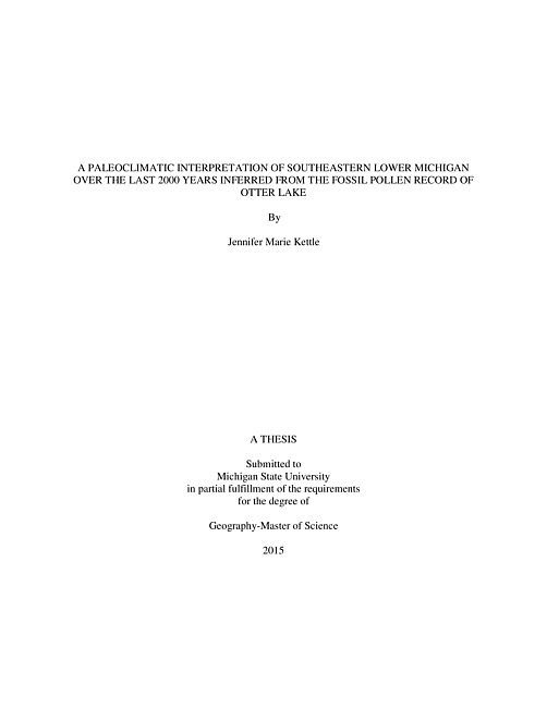 The study of fossil pollen preserved in lakes reconstructs abundance shifts of plant species in response to climate changes, as each species has its particular tolerances for temperature and moisture. Although Michigan has an abundance of inland lakes (~11,000) and hence is a prime area for pollen research, there has been a scarcity of pollen studies, especially in the southeastern portion of the state south of the Tension Zone. Moreover, many of these previous studies were conducted at a poor temporal (centennial) resolution, and therefore do not capture subtle vegetation changes, such as those in response to the Medieval Warm Anomaly (MWA; ~1150-750 cal yr BP) and Little Ice Age (LIA; ~550-150 cal yr BP). The intent of this thesis research was to conduct pollen analysis of a sediment core from Otter Lake, Michigand at high-resolution (~33 years) for the last 2000 years to capture shifts in tree species dominance associated with the MWA and LIA. This research involved several laboratory procedures, which resulted in a pollen diagram that detailed vegetation change over time. The data suggest a weak signal for greater warmth and dryness during the MWA, as evidenced by an increase in the more xeric-adapted Quercus (oak) and Pinus (pine) at the expense of mesic-adapted species like Fagus (beech). A stronger signal was detected for decreased temperatures during the LIA, as indicated by greater abundance of Pinus and Picea (spruce), but the signals for moisture were conflicting. Dramatic decreases in all tree taxa abundance, along with a seven-fold spike in Ambrosia (ragweed), are indicative of land clearing by Euro-American settlers into the area.