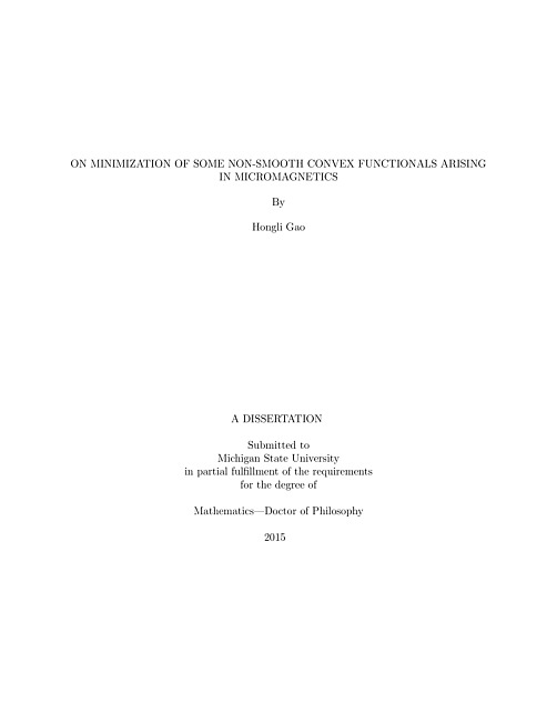 This thesis is motivated by studying the properties of ferromagnetic materials usingthe Landau-Lifshitz theory of micromagnetics. In this theory the state of a ferromagneticmaterial is described by the magnetization vector m in terms of a total micromagnetic energythat consists of several competing sub-energies: exchange energy, anisotropy energy, externalinteraction energy and magnetostatic energy. For large ferromagnetic materials and undersome limiting regimes of the model, the exchange energy can be negligible and the totalenergy becomes a reduced model. Our investigations focus on the study of such a reducedmodel of Landau-Lifshitz theory.The primary focus of the thesis includes two parts: the minimization (static) study andthe evolution (dynamic) study. We investigate a new method for the existence of minimizersof the reduced micromagnetic energy based on a duality method. In this method, the reducedmicromagnetic energy is closely related to a convex functional (the dual functional) on thecurl-free vector functions. Our minimization and dynamics studies are based on the studyof the minimization and gradient ow of this dual functional. Much of the thesis is focusedon the minimization problem of two special cases: soft case and uniaxial case on the annulusdomain; in particular, in the soft case, for some range of the parameter, the energy minimizersof the original micromagnetic energy are constructed through the Euler-Lagrange equationof the dual functional using the characteristics method for a reduced Eikonal type equation.The second direction of our study of this thesis is an attempt to obtain certain reasonabledynamic process for the evolution of m, where the asymptotic behavior of the gradient owof the reduced energy functional is investigated.