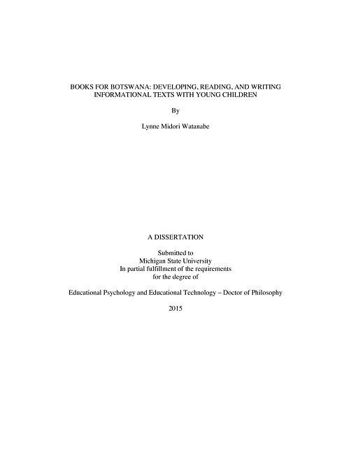 This dissertation contains two manuscripts, both related to the development and use of culturally relevant and sustainable informational texts. The first manuscript is written as a research article reporting on the creation and use of culturally relevant informational texts with young children in Botswana. The manuscript describes the study’s rationale and background, methods of implementation and analysis, findings and implications, limitations, and significance. The second manuscript is written as an article for a practitioner journal, focusing on how to create and use culturally relevant informational texts in the classroom. Both manuscripts draw from the same study of standard two (second year of formal schooling, when children are ages seven to eight) children in Botswana. The study had two research questions: (1) What are culturally relevant informative/explanatory and procedural text topics for standard two students in the northwest region of Botswana? and (2) What changes, if any, occur in standard two students’ emergent reading and writing of informative/explanatory and procedural texts after participating in reading and writing lessons using culturally relevant texts of each genre and in a control group?The study had three phases. In phase one, parent surveys were administered and collected to determine culturally relevant informational text topics. During phase two, survey results were used to create 15 texts (ten informative/explanatory and five procedural) used in 20 lesson plans. Phase three involved the implementation of the developed lessons as an intervention over a six-week period. Forty-four children from a town and rural school were randomly assigned within setting to experimental or control conditions (22 per group). All participating children completed pre- and post-assessments to ascertain their abilities to read and writing procedural and informative/explanatory texts through writing samples and emergent readings.Analyses of surveys from phase one of the project involved tallying and ranking the responses to determine relevant and important topics; 15 topics were selected for the development of texts. To examine the impact of the intervention based on pre- and post-assessments from phase three, I used Wilcoxon signed-rank tests to compare pre- and post-assessments by condition on three types of scores: a stage of writing development score, a holistic score for each genre, and a total trait/feature score for each genre. Results indicate statistically significant increases in post-assessment scores for children in the experimental group for four out of five writing measures: stage of writing development, holistic score for informative/explanatory writing, total trait/feature score for procedural writing, and total trait/feature score for informative/explanatory writing, but no statistically significant effects on emergent reading measures. Children in the control group did not show statistically significant increases in their post-assessment scores for writing or reading.This dissertation research answers calls to meet literacy needs in developing nations, such as by providing access to high quality reading materials, teaching reading and writing together, and instilling a spirit of evaluation in research and school contexts (Hoffman, 2009). It contributes to the field by providing evidence that informational texts on culturally relevant topics can be used to leverage increases in student achievement, even after a brief intervention of twenty 15-20 minute lessons in a six-week period. It also suggests practical implications for determining culturally relevant informational text topics and the creation and use of texts with young children.
