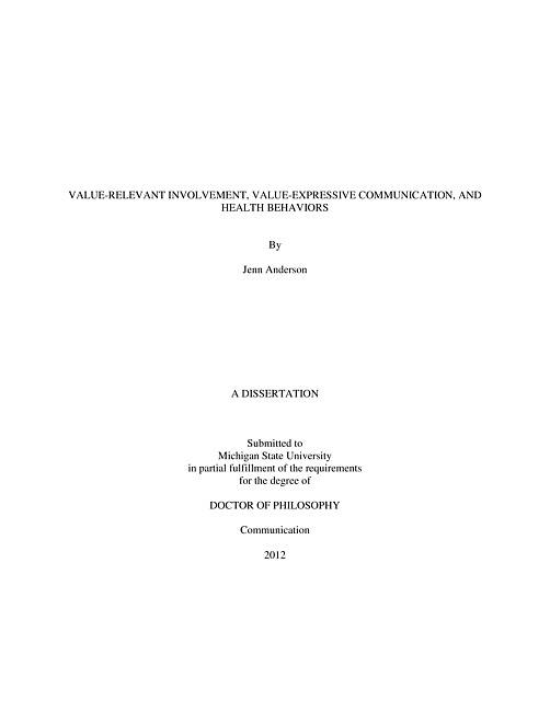 This study extends research on value-expressive communication (Anderson, 2011a) by exploring its relationship to value-relevant involvement (Johnson & Eagly, 1989; Sherif & Hovland, 1963) and certain health behaviors (i.e., moderate drinking, condom use, and dieting). Value-expressive communication is the verbalization of a value-expressive attitude (Katz, 1960) in an interpersonal context. Because value-expressive communication verbalizes a value-expressive attitude, and value-relevant involvement is a psychological state that indicates one holds a value-expressive attitude, this study proposes that value-relevant involvement (VRI) will be positively related to value-expressive communication (VEC) and to behavioral intentions (BI). In addition, this study proposes that value-expressive communication about a health behavior will be related to intentions to enact that behavior. This study further posits that personal values will be related to behavioral intentions and moderate the VRI-BI and VEC-BI relationships. N = 547 college students completed an online survey in one of three conditions (moderate drinking, condom use, or dieting). Study results indicate that hedonism was a negative predictor of moderate drinking intentions and universalism was a positive predictor of condom use intentions; no other values had significant direct effects on intention. Value-relevant involvement had a significant, positive direct effect on value-expressive communication with close friends about all three behaviors; and value-relevant involvement had a significant, positive direct effect on behavioral intentions across all behavioral domains. However, the proposed interaction between value-relevant involvement and values was not significant in any behavioral domain. Attitudes explained significant variance in behavioral intentions across all domains. Finally, value-expressive communication with close friends had a significant direct effect on intentions to drink in moderation (among those who planned to drink). However, the proposed three-way interaction between value-expressive communication, attitudes, and values was not significant in any behavioral domain.This study provides support for the proposed relationship between value-expressive communication and value-relevant involvement. Observing this relationship supports the conceptualization of value-expressive communication as the verbalization of a value-expressive attitude since value-relevant involvement is a psychological state that indicates one holds a value-expressive attitude.