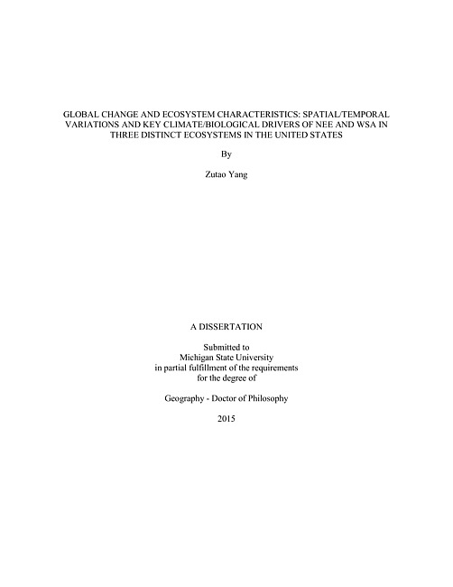Global change and ecosystem characteristics : spatial/temporal variations and key climate/biological drivers of NEE and WSA in three distinct ecosystems in the United States