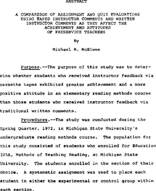 A comparison of assignment and quiz evaluations using taped instrutor comments and written instructor comments as they affect the achievement and attitudes of preservice teachers