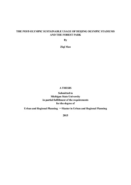 This thesis investigates ways to sustainably reuse and development Olympic venues and Forest Park that were used in the 2008 Beijing Olympic Games. Through surveys and interviews with residents of and visitors to the area, the author learns the reasons why some venues were abandoned after the Olympics and recommends ways to use the venues and improve the area while addressing econommic and environmental issues as well as concerns about social equitability.