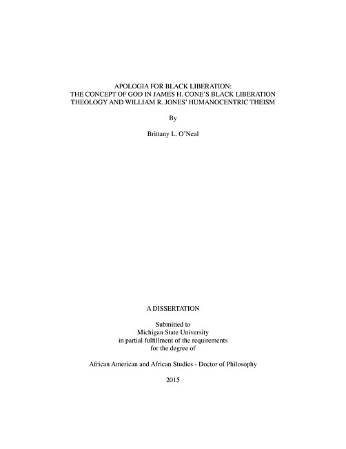 ABSTRACTApologia for Black Liberation: The Concept of God in James H. Cone’s Black Liberation Theology and William R. Jones’ Humanocentric TheismBy Brittany L. O’Neal During the formative years of Black Liberation Theology in the 1960s there was a collective understanding that Black liberation was necessary, however there was not much agreement on the optimal way for liberation to be actualized in the lived reality of African Americans. This dissertation explores two factions of Black Liberation Theology; the conventional views of Black Liberation Theology through the auspice of James H. Cone and the philosophical theology of Williams R. Jones' humanocentric theism. The former is an avid supporter of a Christian, biblical-focused theology and the latter fills a theological position aligned with philosophical tendencies. The purpose of this dissertation is to examine the doctrinal shifts that have accompanied Black Liberation Theology (BLT) as a new conceptual position in Liberation Studies. This dissertation explores the dialectical dimensions of concepts of God and whether the respective theologies of Cone and Jones undergird a system of oppression. Black Liberation Theology needs to be reassessed for two reasons; because we need to (re)examine our value systems to ensure they are in fact working in our favor and to ensure Black Liberation Theology includes theological perspectives outside the traditional confines of Christian theology. Other forms of theism and nontheism; including secular humanism and atheism are considered as relevant religious perspectives for African Americans. As a way to forward an ideology of liberation, this study examines the potentiality of a philosophical framework as a viable and sufficient method for African Americans Studies. Consequently, this dissertation is descriptive and corrective in it examination of two unique concepts of God associated with Black Liberation Theology.
