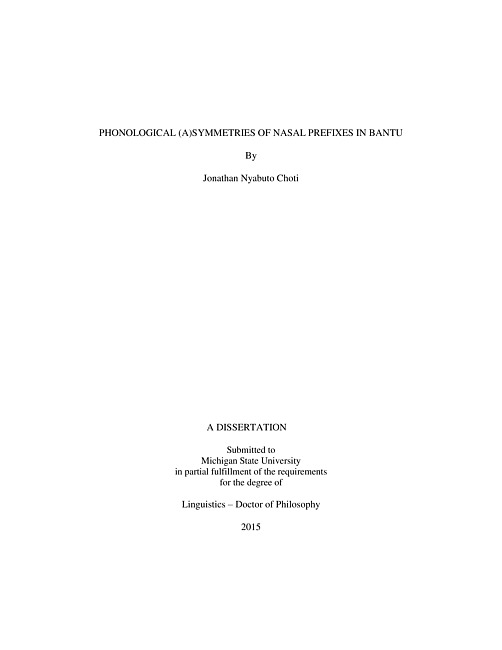 PHONOLOGICAL (A)SYMMETRIES OF NASAL PREFIXES IN BANTUByJonathan Nyabuto ChotiThis study investigates segmental alternations triggered by Bantu nasal prefixes of class 9/10 and 1SG subject and object (henceforth, /N/). The realization of /N/ is associated with a wide range of segmental altenations that affect the preceding vowel, /N/ itself, and stem-initial segments. The alternations examined in this study have been organized into three groups: (a) /N/ in prenasal vocalic and nonlocal alternations; (b) alternations that affect /N/; and (c) postnasal alternations. The vocalic processes that occur before /N/ include vowel epenthesis, vowel lengthening, and initial vowel shortening. The behavior of /N/ in nonlocal processes involve Meinhof’s Law, Dahl’s Law, and nasal-consonant harmony. The processes examined that target /N/ include nasal place assimilation, effacement, devoicing, aspiration, and syllabicity alternation. The realization of /N/ before vowel-initial stems is also examined. The effect of /N/ on stem-initial consonants is reflected in a series of postnasal alternations such as (de)nasalization, (de)voicing, (de)aspiration, debuccalization, de-implosion, (de)affrication, nasal substitution, consonant deletion, and hardening. These processes have been described and analyzed.Thus, thiis dissertation brings together from a sample of 24 Bantu languages the range of segmental patterns associated with /N/ and formalizes them within two phonological models, that is, moraic theory and Element-based Dependency (EBD). The study contributes to the general investigation into nasality and develops an overview of the range of issues and data related to the study of /N/ in Bantu. The main goal of the study is to describe and account for the crosslinguistic variations of alternations conditioned by /N/. The (non-)occurrence of prenasal vowel epenthesis and lengthening are attributed to differences related to contrastive vowel length. The two processes are shown to occur in languages with contrastive vowel length. They arise from the demorification of /N/ after /N/ is demorified. A moraic model is adopted to formalize the two alternations that occur to rescue the mora vacated by /N/. /N/ is shown to be non-moraic in languages without contrastive vowel length; these disallow vowel epenthesis and CL. CL before /N/ is blocked initially due to an overriding Initial Vowel Shortening rule (IVS). The consonantal alternations conditioned by /N/ have been formalized within EBD. This model uses elements as monovalent features to represent segmental structure and processes. The main operations used to represent processes include linking, deletion/delinking, switching, and adding. Segmental alterntions that involve simpler and fewer operations are more frequent than those that involve more and/or complex operations. Switching of elemnts is the most complex operation while the rest are simple. Nasalization, nasal place assimilation, (de)voicing, and (de)aspiration are frequent alternations induced by /N/ beacause they each involve a simple and single operation. Postnasal (de)affrication are infrequent for they involve a switching operation.This study shows that crosslinguistic variations in the processes triggered by /N/ are determined by language-specific phonology and the phonological structures of nasal manner, other manner types, place, and laryngeal properties of segments. Some variations relate to laryngeal contrasts some of which, for instance, aspiration, voicelessness, and breathy voice have been reanalyzed terepreted as phonetic variations of the same phonological segment represented by the same element that is used for fricatives.