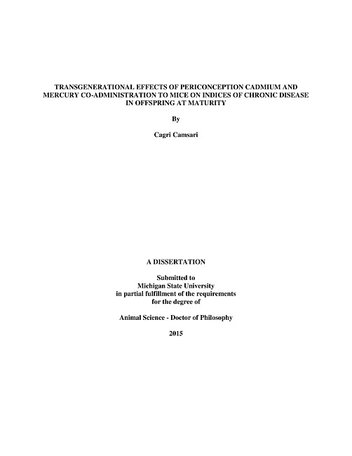 The rapidly growing increase in prevalence of adult chronic diseases poses a significant long term threat to health and well being of humans. While the etiology of chronic diseases is complex, a growing body of evidence indicates the in utero environment can determine susceptibility of offspring to adult chronic diseases. For the last decade, much emphasis has been placed on impact of nutritional insults. Less attention has been placed on in utero developmental programming effects of exposure to environmental contaminants such as the heavy metals, cadmium (Cd) and mercury (Hg). Cadmium and Hg are widely used in various industries with limited understanding of their developmental programming effects. Available data suggest that individual exposure to Cd or Hg throughout pregnancy can impact birth weight, glucose homeostasis and behavior of offspring. Moreover, accumulating evidence suggests that developmental programming effects of adverse in utero conditions are not limited to offspring directly exposed to relevant insults and effects can persist in subsequent generations even in the absence of original insult. However, developmental programming effects of combinational exposure to Cd and Hg in the context of administration during early life, even before conception, and their persistent transgenerational effects have not been studied. Therefore, it was hypothesized that periconception co-administration of Cd and Hg increase indices of chronic diseases in offspring at adulthood in subsequent generations. This hypothesis was tested by a) subcutaneously administering Cd and Hg at 0, 0.125, 0.5 and 2 mg/kg body weight doses of each compound to adult naïve female CD1 mice four days before and four days after conception b) determined anxiety-like behavior, glucose homeostasis, insulin sensitivity, body weight gain and abdominal adiposity, and serum and molecular markers of metabolic syndrome in offspring of control females and females treated with Cd and Hg and c) determined persistent transgenerational effects in F2-F4 generation offspring in the absence of additional heavy metal exposure. Results indicate anxiety-like behavior was increased in male offspring and glucose tolerance was impaired in male and female offspring of Cd plus Hg-treated females. Male offspring of treated females in the F1 generation displayed molecular and endocrine markers of insulin resistance, including significantly higher serum concentrations of insulin and leptin, higher glucose concentrations in response to insulin administration, as well as increased mRNA abundance for genes associated with glucose and lipid homeostasis in liver and decreased mRNA abundance in abdominal adipose tissue. Increased anxiety-like behavior persisted in the F2 generation male offspring descended from the female germ line but not in subsequent generations. Glucose homeostasis was altered in male offspring descended from the maternal germ line through four generations, including impaired glucose tolerance and increased phosphorylation of insulin receptor substrate 1 (IRS1) at serine residue 307, a biochemical indicator of insulin resistance. Increased body weight gain and abdominal adiposity was observed in male but not female offspring through the F4 generation who were descendants of periconception Cd plus Hg-treated females (F0 generation). Based on these results, it is concluded that periconception heavy metal administration to female mice impacts developmental programming of offspring susceptibility to chronic diseases later on adulthood and the effects persist transgenerationally in male offspring and are inherited through the maternal germ line.
