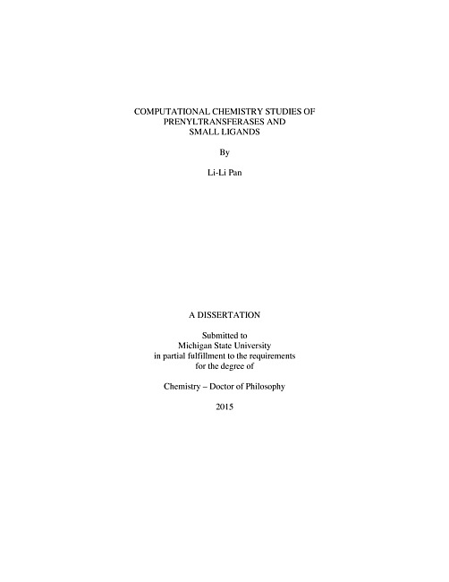In this dissertation computational chemistry methods were applied to study the properties of prenyltransferase FtmPT1 and small ligand conformational changes. First, I have done thorough investigations on FtmPT1 enzyme catalysis by the quantum mechanics and molecular mechanics method. FtmPT1 is a fungal indole prenyltransferase that catalyzes the reaction of tryptophan derivatives with dimethylallyl pyrophosphate to form various biologically active compounds. Herein I describe detailed studies of FtmPT1 catalysis involving dimethylallyl pyrophosphate and Brevianamide F following the native pathway (yielding Tryprostatin B) and an alternate pathway observed in the Gly115Thr mutant of FtmPT1, yielding a novel cyclized product. Importantly, these two products arise from the same intermediate state, meaning that a step other than the cleavage of the dimethylallyl pyrophosphate (DMAPP; C-O) bond is differentiating between the two product reaction channels. From detailed potential of mean force (PMF) and 2-D PMF analyses I conclude that the rate-limiting step is the cleavage of the C-O bond in DMAPP, while the deprotonation/cyclization step determines the final product distribution. Hence, in the case of FtmPT1, the optimization of the necessary catalytic machinery guides the generation of the final product after the intermediate carbocation formation.I also describe a conformational search algorithm using the “Movable Type” (MT) sampling method. Differing from traditional systematic and stochastic searching algorithms, this method uses probability information to facilitate the selection of the best conformations. The generated ensembles provided good coverage of the available conformation space including available crystal structures. Furthermore, my approach directly provides the solvation free energies and the relative gas and aqueous phase free energies for all generated conformers. The method was validated against thorough analyses on thrombin ligands as well as against structures extracted from both the Protein Data Bank (PDB) and the Cambridge Structural Database (CSD). These studies demonstrate that this MT-based ligand conformational search algorithm is a powerful approach for delineating the conformer ensembles of molecular species.