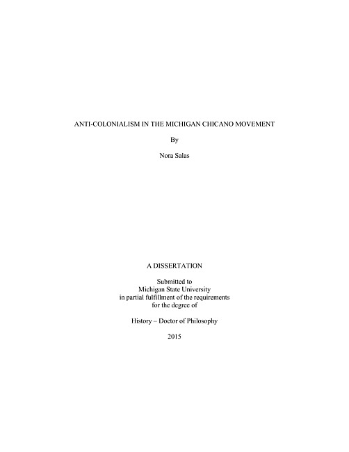 In this dissertation I argue anti-colonial thought in Michigan’s Chicano Movement was a response to a domestic/migrant colonial discourse that operated on a local and state-wide level. Between 1962 and 1967 Mexican-Americans and other Latinos lobbied Michigan’s elected officials to gain the rights of industrial workers for seasonal agricultural workers. Their efforts were stymied by growers and the Michigan Farm Bureau. The MFB and its allies reinforced their opposition with a domestic/migrant colonial binary that defined all Mexican-Americans as foreigners and justifiably colonized. By 1968 Chicano anti-colonialism emerged in Michigan to counter this colonial discourse through organizing, literature and art. I contend that the development of anti-colonial thought amongst Chicanos in Michigan demonstrates that Mexican-Americans experienced colonialism not only in the immediate aftermath of the Mexican-American War or in former Mexican territory. This dissertation demonstrates the viability of a different history wherein colonialism was not contained in the Southwest as a short-lived exception to American liberalism. By situating Michigan Chicano Movement anti-colonialism as a response to a locally based colonial discourse I emphasize the ways in which a critique of American imperialism was central to the Chicano Movement nationwide. Furthermore Michigan Chicanos and Chicanas experienced multiple forms of colonial domination. They were not only workers excluded from the public sphere of benefits and rights but also lived as families whose private sphere was compromised. In addition to racializing Chicanos as foreigners the domestic/migrant colonial binary gendered Chicano families as dependent, needy and ultimately female. Chicano anti-colonialism also presented a gendered narrative whose history has often been seen as synonymous with patriarchy. Instead I argue that Chicana and Chicano uses of anti-colonial ideals, especially la familia de la raza, included more liberatory possibilities.