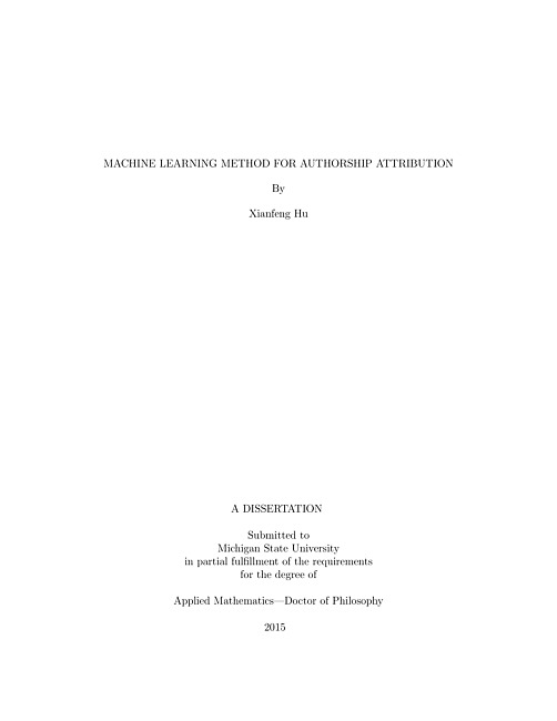 MACHINE LEARNING METHOD FOR AUTHORSHIP ATTRIBUTIONBy Xianfeng HuBroadly speaking, the authorship identification or authorship attribution problem is to determine the authorship of a given sample such as text, painting and so on. Our main work is to develop an effective and mathe-sound approach for the analysis of authorship of doubted books.Inspired by various authorship attribution problems in the history of literature and the application of machine learning in the study of literary stylometry, we develop a rigorous new method for the mathematical analysis of authorship by testing for a so-called chrono-divide in writing styles. Our method incorporates some of the latest advances in the study of au- thorship attribution, particularly techniques from support vector machines. By introducing the notion of relative frequency of word and phrases as feature ranking metrics our method proves to be highly effective and robust.Applying our method to the classical Chinese novel Dream of the Red Chamber has led to convincing if not irrefutable evidence that the first 80 chapters and the last 40 chapters of the book were written by two different authors.Also applying our method to the English novel Micro, we are able to confirm the existence of the chrono-divide and identify its location so that we can differentiate the contribution of Michael Crichton and Richard Preston, the authors of the novel.We have also tested our method to the other three Great Classical Novels in Chinese. As expected no chrono-divides have been found in these novels. This provides further evidenceof the robustness of our method. We also proposed a new approach to authorship identification to solve the open classproblem where the candidate group is nonexistent or very large, which is reliably scaled from a new method we have developed for the closed class problem in which the candidates author pool is small. This is attained by using support vector machines and by analyzing the relative frequencies of common words in the function words dictionary and most frequently used words. This method scales very nicely to the open class problem through a novel author randomization technique, where an author in question is compared repeatedly to randomly selected authors. The author randomization technique proves to be highly robust and effective. Using our approaches we have found answers to three well known authorship controversies: (1) Did Robert Galbraith write Cuckoo’s Calling? (2) Did Harper Lee write To Kill a Mockingbird or did her friend Truman Capote write it? (3) Did Bill Ayers write Obama’s autobiography Dreams From My Father?