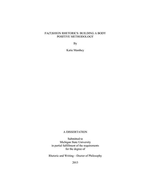 This dissertation combines feminist and queer issues of embodiment, fat, and clothing by investigating how fat fashion bloggers make meaning through their dress practices in ways that are rhetorical, material, and embodied. In this project I argue for a methodology of “ethical reading” where a viewer must acknowledge their own positionality, and engage with bodies both materially and rhetorically. I enact this methodology by interviewing three self-identified fat fashion bloggers in three different countries. My research participants demonstrate how meaning can be made through clothing and the fat body itself in order to embody “fat” in diverse ways, including radical, queer, traditional, and heteronormative. This work contributes to notions of material and visual rhetoric by drawing from theories of dress that include body fat and clothing and extends work from fat studies, dress studies, and gender studies by engaging them in rhetorical analysis.