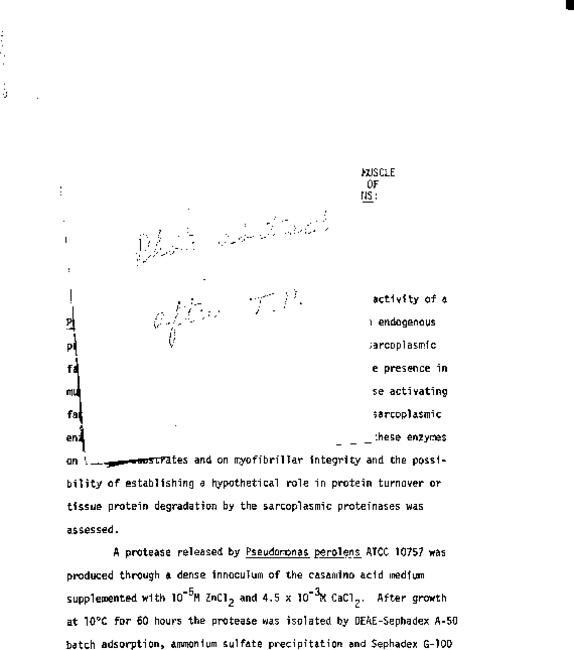 A comparison of two endogenous skeletal muscle proteases and an exogenous protease of bacterial origin, Pseudomonas perolens : effects and activities