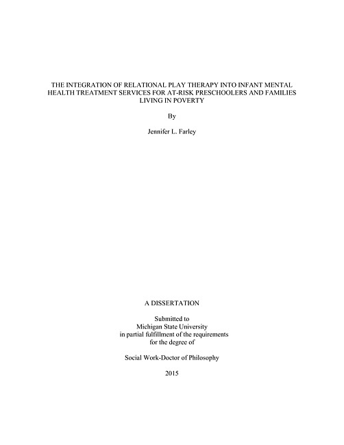 ABSTRACT THE INTEGRATION OF RELATIONAL PLAY THERAPY INTO INFANT MENTAL HEALTH TREATMENT SERVICES FOR AT-RISK PRESCHOOLERS AND FAMILIES LIVING IN POVERTY By Jennifer L. Farley A mixed-method study was conducted to examine the process of integrating Relational Play Therapy (RPT) into Infant Mental Health (IMH) treatment services for at-risk preschoolers and families living in poverty. Interviews with parents and clinicians highlight the need for tailored treatment interventions and clinical supportive services to promote protective factors and reduce child and parent risk factors associated with living in poverty. Clinicians and parents reported a variety of RPT and IMH interventions and treatment models that were delivered within a consistent treatment process with four distinctive aspects, all of which heightened parental involvement. RPT interventions were used more often than IMH interventions and significant relationships between RPT and IMH models and other treatment interventions indicate a need for specialized techniques within Non-RPT treatment models or a need for clinicians to tailor Non-IMH treatment models to center on attachment reparation. The clinician-parent relationship served as a conduit to deliver treatment interventions and clinical supportive services. Within the context of a supportive clinical relationship, parents reported feeling more confident and empowered to advocate for their child to friends and family, which led to improved familial understanding, improved natural supports and fewer feelings of social isolation. Further development of the integrative model along with clinical, research and implications are examined.