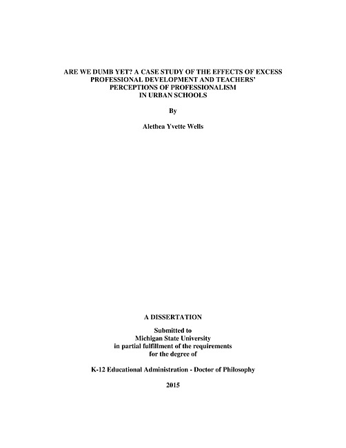 ABSTRACTARE WE DUMB YET? A CASE STUDY OF THE EFFECTS OF EXCESS PROFESSIONAL DEVELOPMENT AND TEACHERS’ PERCEPTIONS OF PROFESSIONALISM IN URBAN SCHOOLSByAlethea Y. WellsThis qualitative case study combined an action research method with a first-person critical action case study to introduce a first-person action case study. This study critically explored the effects of excess professional development on teacher perceptions’ as professionals. The purpose of this first-person action case study was to address the lack of research that critically explores the impact the amount of professional development has on urban teachers’ perceptions of themselves as professionals, as well as their practice. Illich’s (1980) three dimensional theory of development was the theoretical framework used in this study and the results supported the notion that excess professional development is counter-productive, nurtures an environment of degradation, and negatively impacts teacher perceptions of themselves as professionals. The interview and observation data concluded that excess professional development negatively impacts teachers’ perceptions of themselves as professionals which negatively impacted their practice as well. This case study and the findings produced three (3) major themes: (1) Teachers equate professionalism with a high sense of morality, (2) Professional growth is driven by rewards and expectations, and (3) Teachers transform into defenders of the profession and their professional identity. This case study also introduced the need for a first-person participatory critical action approach which allowed the researcher to insert herself as a participant in the study. In this first person approach, three (3) additional findings or minor themes emerged: (a) The resiliency of the researcher had bred a sense of righteous indignation, (b) Emancipation and freedom are essential to professional growth, and (c) Urban school teachers are an endangered species. Suggestions for further research has been given in the area of teacher identity, urban teacher preparation courses, and more first-person action studies where the voice of the teacher can be heard as both the researcher and a participant.