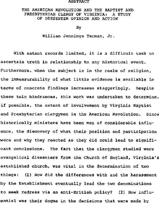 The American Revolution and the Baptist and Presbyterian clergy of Virginia : a study of dissenter opinion and action