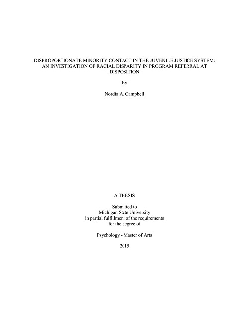 ABSTRACTDISPROPORTIONATE MINORITY CONTACT IN THE JUVENILE JUSTICE SYSTEM:AN INVESTIGATION OF RACIAL DISPARITY IN PROGRAM REFERRAL AT DISPOSITIONByNordia A. CampbellDisproportionate minority contact (DMC) has plagued the juvenile justice system since its inception. Historically, racial minority youth have also received harsher punishments at the disposition stage when compared to White youth (Moore & Padavic, 2010). Furthermore, research has indicated that these disparities exist despite the use of risk assessment tools, which are theoretically used to reduce human biases in case management decisions. Therefore, the current study aims to investigate the role of race in a particular dispositional decision–program referral–after taking risk assessment into account. Using a sample of juvenile offenders (N = 2,739) from a midsized Midwestern county, the study used the Youth Level of Service/Case Management Inventory (YLS/CMI) to determine if risk assessment variables and race were predictors of program referral. Specifically, the study examined whether risk score and cluster type predicted program referral, and if race moderated the relationships found. This study adds to the literature, as there is a lack of previous research investigating program referral as a point of racial disparity in the juvenile justice system. Results indicated that race predicts program referral, such that minority youth are more likely to be programmed than their White counterparts, even after controlling for risk cluster type. Future directions for research on DMC, as well as practical implications for juvenile court officials are discussed.
