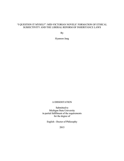 This dissertation explores the socio-economic dimensions of inheritance in notable mid-Victorian novels and their engagement with contemporary social debates over amending feudal inheritance laws. The dissertation argues that these novels contributed to reinforcing a reactionary cultural force that drove the compromised liberal legislation of new inheritance laws. The reform of the inheritance laws, led by Victorian liberals, focused on strengthening absolute testamentary power while displacing radical reformers’ demand for state intervention in redistributing inherited wealth into the hands of broader population. The liberals prioritized the cultivation of individual moral capacity or character-building over the improvement of economic equality. With their generic narrative power, mid-Victorian novels about inheritance dramatized the liberal reformers’ socio-economic ideas and sought to shape a subject who would internalize those ideas in his or her mind. My dissertation also illuminates how mid-Victorian liberals’ reasoning for the reform exposes a paradox in liberalism and a limit of the distinctive Victorian concept of ethical subjectivity.