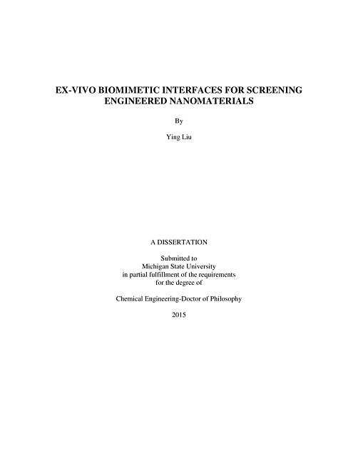 AbstractEX-VIVO BIOMIMETIC INTERFACES For Screening engineered nanomaterialsByYing LiuEngineered nanomaterials (ENM) have attractive functional properties and are increasingly being used in commercial products. However, the potential health risks induced by ENM are poorly understood and difficult to evaluate. Since the first step in ENM toxicology pathway is to interface with cell membranes to trigger biological effects, improved methods are needed to measure ENM-biomembrane interactions. Therefore, the overall objective of my doctoral dissertation is to develop robust, high throughput nano-structured biosensors, to elucidate mechanisms of surface interaction between ENM and biomembrane, to evaluate ENM kinetics and performance, to predict ENM induced health risk, and to provide guideline for bio-safety design of nano-products with desired functions. The first generation of higher throughput interface was developed by accelerating the interface-assembly process and enhancing stability of a planar bilayer lipid membrane (pBLM). The diameter of a classical planar BLM is ~500 m. The novel planar BLM developed for this project was fabricated on nanopores (~700 nm) drilled through silicon nitride thin film using focused ion beam lithography. The resulting nano-biosensor enabled automatic BLM formation after integration into a microfluidic device with enhanced mechanical stability. Electrophysiology and electrochemical impedance spectroscopy was used to validate functionality of the nanopore pBLM. Then, transient current spikes induced by silica nanoparticles and integral conductance induced by carboxylate multi-wall carbon nanotubes, across giga-ohm nanopore pBLM, were measured. The chronoamperometric traces have single-pore sensitivity and temporal resolution on the order of millisecond. However, the first generation BLM requires manual formulation and expensive screening equipment, limiting its potential of commercialization.As a result, the second generation of high throughput biomimetic interface, tethered BLM on gold electrode was developed. Immobilization of BLM on surfaces offers advantages over pBLM, including enhanced stability and ion reservoir. Another advantage associated with tethered BLM is that it can be integrated onto complementary metal–oxide–semiconductor based microsystem with on-chip electrochemical detection. Using molecular self-assembly, the resulting microelectrode array based tethered BLM forms a continuous use and label-free detection platform that is suitable for microsystem implementation. The model interface, tethered BLM, verifies the viability of biocompatible fabrication technologies and is a milestone toward integrating electrochemical biosensor arrays and microelectronic instrumentation into high throughput, manual free and cost effective drug screening applications.Here, pore forming activities of functionalized silica nanoparticles, functionalized polystyrene nanoparticles (PNP) and functionalized polypropargyl glycolide nanoparticles (PGL) were characterized using high insulating tethered BLM. Electrical resistance trajectory was analyzed using empirical exponential model, providing dynamic information of ion leakage induced by various nanoparticles. Coupled with statistical hierarchical clustering post-analysis, the tethered BLM method could distinguish between nanoparticles based on size, charge and/or surface functional groups by monitoring dynamic electrical resistance and overall resistance loss. However, the exponential model failed to reproduce the resistance trend for –OH terminated PGL. As a result, a mechanistic kinetic model was developed to predict interaction kinetics of ENM with model BLM and to correlate effects of different component, and to assess biosensor performance. A 9 parameter model was designed using MATLAB and R, and then simplified into a 3 parameter model. The model developed helps elucidate molecular processes responsible for time-evolved electrochemical property/signal changes in tethered BLM following ENM exposure. Assuming second order reaction kinetics, the model uses two kinetic constants to describe the rates of ENM binding to, and lipid removal from, the interface. The rates were dependent on number of free nanoparticles, available site on the interface and mobile lipids fraction. The model was fit to membrane resistance, Rm vs. time data for interaction of a tethered BLM with two types of ENM: PGL and functionalized polystyrene nanoparticles. The model was able to predict diverse trends in the Rm vs. time data, including a continuous decrease (PNP) in Rm and an initial increase (PGL) in Rm followed by a decrease. The model also predicted that the biosensor is so sensitive that the interaction involving only 10-8% of bulk nanoparticles could generate measurable changes in the biosensor output. Then, kinetic constants for ENM extracted from time-evolved trends were analyzed using hierarchical clustering. The resulting dendrograms showed that ENM with different properties (composition, size, surface charge) could be statistically distinguished using this approach.