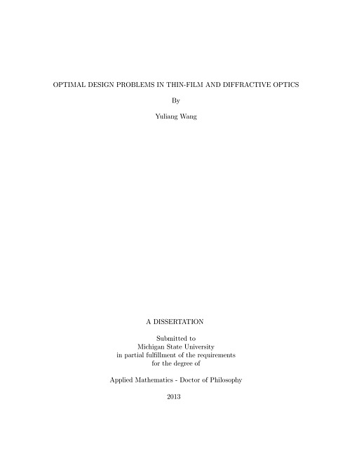 Optical components built from thin-film layered structures are technologically very important. Applications include but are not limited to energy conversion and conservation, data transmission and conversion, space technology, imaging and so on. In practice these structures are defined by various parameters such as the refractive-index profile, the layer thickness and the period. The problem to find the combination of parameters which yield the spectral response closest to a given target function is referred to as optimal design. This dissertation considers several topics in the mathematical modeling and optimal design of these structures through numerical optimization. A key step in numerical optimization is to define an objective function the measures the discrepancy between the target performance and that of the current solution. Our first topic is the impact of the objective function, its metric in particular, on the optimal solution and its performance. This is done by numerical experiments with different types of antireflection coatings using two-material multilayers. The results confirm existing statements and provide a few new findings, e.g. some specific metrics can yield particularly better solutions than others. Rugates are optical coatings presenting continuous refractive-index profiles. They have received much attention recently due to technological advances and their potential better optical performance and environmental properties. The Fourier transform method is a widely used technique for the design of rugates. However, it is based on approximate expressions with strict assumptions and has many practical limitations. Our second topic is the optimal design of rugates through numerical optimization of objective functions with penalty terms. We found solutions with similar performance and novel solutions by using different metrics in the penalty term. Existing methods used only local basis functions such as piece-wise constant or linear functions for the discretization of the refractive-index profile. Our third topic is the use global basis functions such as sinusoidal functions in the discretization. A simple transformation is used to overcome the difficulty of bound constraints and the result is very promising. Both multilayer and rugate coatings can be obtained using this method. Diffraction gratings are thin-film structures whose optical properties vary periodically along one or two directions. Our final topic is the optimal design of such structures in the broadband case. The objective functions and their gradient are obtained by solving variational problems and their adjoints with finite element method. Interesting phenomena are observed in the numerical experiments. Limitations and future work in this direction are pointed out.