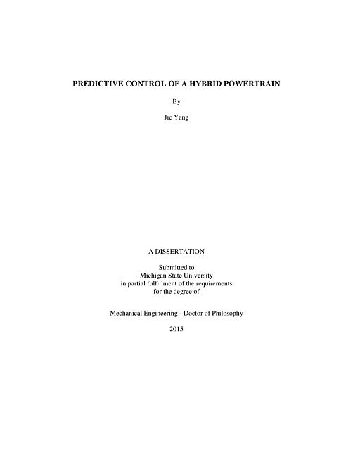 Powertrain supervisory control strategy plays an important role in the overall performance of hybrid electric vehicles (HEVs), especially for fuel economy improvement. The supervisory control includes power distribution, driver demand fulfillment, battery boundary management, fuel economy optimization, emission reduction, etc. Developing an optimal control strategy is quite a challenge due to the high degrees of freedom introduced by multiple power sources in the hybrid powertrain. This dissertation focuses on driving torque prediction, battery boundary management, and fuel economy optimization.For a hybrid powertrain, when the desired torque (driver torque demand) is outside of battery operational limits, the internal combustion (IC) engine needs to be turned on to deliver additional power (torque) to the powertrain. But the slow response of the IC engine, compared with electric motors (EMs), prevents it from providing power (torque) immediately. As a result, before the engine power is ready, the battery has to be over-discharged to provide the desired powertrain power (torque). This dissertation presents an adaptive recursive prediction algorithm to predict the future desired torque based on past and current vehicle pedal positions. The recursive nature of the prediction algorithm reduces the computational load significantly and makes it feasible for real-time implementation. Two weighting coefficients are introduced to make it possible to rely more on the data newly sampled and avoid numerical singularity. This improves the prediction accuracy greatly, and also the prediction algorithm is able to adapt to different driver behaviors and driving conditions.Based on the online-predicted desired torque and its error variance, a stochastic predictive boundary management strategy is proposed in this dissertation. The smallest upper bound of future desired torque for a given confidence level is obtained based on the predicted desired torque and prediction error variance and it is used to determine if the engine needs to be proactively turned on. That is, the engine can be ready to provide power for the “future” when the actual power (torque) demand exceeds the battery output limits. Correspondingly, the battery over-discharging duration can be reduced greatly, leading to extended battery life and improved HEV performance.To optimize powertrain fuel economy, a model predictive control (MPC) strategy is developed based on the linear quadratic tracking (LQT) approach. The finite horizon LQT control is based on the discrete-time system model obtained by linearizing the nonlinear HEV and only the first step of the solution is applied for current control. This process is repeated for each control step. The effectiveness of the supervisory control strategy is studied and validated in simulations under typical driving cycles based on a forward power split HEV model. The developed MPC-LQT control scheme tracks the predicted desired torque trajectory over the prediction horizon, minimizes the powertrain fuel consumption, maintains the battery state of charge at the desired level, and operates the battery within its designed boundary.