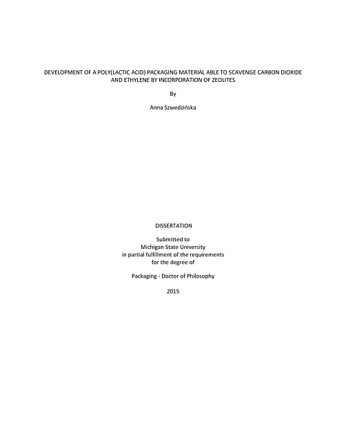 ABSTRACTDEVELOPMENT OF A POLY(LACTIC ACID) PACKAGING MATERIAL ABLE TO SCAVENGE CARBON DIOXIDE AND ETHYLENE BY INCORPORATION OF ZEOLITESByAnna Szwedzińska Poly(lactic acid) is a biobased polymer and known to biodegrade reasonably quickly in commercial compost. There has been a growing interest in using it as a replacement for petrochemical based polymers due to its environmental-friendliness. Zeolites are crystalline hydrated aluminosilicates of alkali and alkaline earth elements. They can be natural minerals or produced synthetically. Depending on their framework they can have different structures and different pore sizes which makes them sorption-specific systems for various volatiles. There is a growing interest in their application in food packaging as they can adsorb and absorb gases crucial for extending shelf life of fresh produce, like ethylene and CO2. Active packaging systems are efficiently used in food packaging. Studies show that PLA and zeolites can be combined into one material by extrusion. Now the question is if they can act as an efficient active packaging system. Results obtained showed that two chosen zeolites, natural clinoptilolite and synthetic type 4A, have high sorption capacities for ethylene and carbon dioxide. Experimental conditions were varied, temperatures of 230C and 70C, relative humidities of 0% and 100%, headspace gases composed of varying combinations and concentrations of ethylene, carbon dioxide, nitrogen, and oxygen. Although low temperature and the presence of water in the system decreased sorption capacities of the zeolites, most measured amounts of adsorbed ethylene and carbon dioxide were relevant to concentrations produced and higher than concentrations tolerated by fresh produce, and were promising enough to continue investigating these two zeolites when incorporated into/onto PLA films. Two techniques to produce PLA/zeolite films were tested, extrusion (followed by injection molding and compression)and bar solution coating. The second method resulted in films with higher sorption potential for the two investigated gases since extrusion resulted in the zeolites being too deeply incorporated into the polymer matrix and having PLA as the polymer with good barrier properties towards ethylene did limit their sorption capacities. Further development of the most efficient coating solution and coating method resulted in production of two zeolite coated PLA films. The newly developed films were compared in sorption studies to two commercially available bags that are claimed to be ethylene scavengers and as a result to extend fresh produce shelf life. PLA films proved to be comparable to one of the commercial bags comprised of LDPE impregnated with zeolites. The second commercial product did not show significant sorption of either of the two gases of interest. All film samples were tested in two conditions (230C, 0% RH and 70C and 100% RH).Although in both cases sorption of ethylene and carbon dioxide was smaller than for powder zeolites, with even higher decrease in low temperature and in the presence of water, the resulting sorbed amounts were still relevant to real life situations. Experiments designed to determine whether those films could be reused showed that both zeolite coated PLA films could be successfully reused in room temperature, the same as for the commercial film.