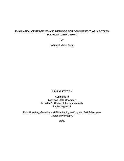 Genome editing using sequence-specific nucleases (SSNs) is rapidly becoming a standard tool for genetic engineering in crop species. The implementation of zinc finger nucleases (ZFNs), transcription activator-like effector nucleases (TALENs) and CRISPR/Cas (clustered regularly interspaced short palindromic repeats (CRISPR)/CRISPR-associated systems (Cas)) for inducing double-strand breaks enables targeting of virtually any sequence for genetic modification. Targeted mutagenesis via nonhomologous end-joining (NHEJ) and gene targeting via homologous recombination (HR) have been demonstrated in a number of plant species but reports have been limited in vegetatively propagated crops, such as potato (Solanum tuberosum Group Tuberosum L.) The aim of this dissertation was to develop reagents and methods for genome editing in potato. This was accomplished by demonstrating TALEN and CRISPR/Cas reagents targeting the potato ACETOLACTATE SYNTHASE1 (ALS1) gene were successful in inducing targeted mutations in reporter and endogenous gene targets. Targeted mutations using CRISPR/Cas were capable of both clonal and germline transmission, making CRISPR/Cas the preferred reagent for this application. TALEN and CRISPR/Cas reagents were also used in combination with a geminivirus expression vector for gene targeting experiments to incorporate point mutations within the ALS1 locus. Transformed events modified by both TALEN and CRISPR/Cas reagents in the geminivirus expression vector carried gene targeting modifications that supported reduced herbicide susceptibility phenotypes. Gene targeting modification detection and reduced herbicide susceptibility phenotypes were enhanced by regenerating lines under high selection. The evaluated reagents and methods in this dissertation provide a frame work for genome editing in potato and other vegetatively propagated crops and have important implications for basic research and agriculture.