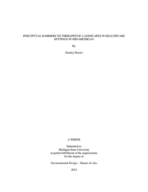 ABSTRACTPERCEPTUAL BARRIERS TO THERAPETUIC LANDSCAPES IN HEALTHCARE SETTINGS IN MID-MICHIGANByEmaley Baxter This thesis examines perceptual barriers to, and current use of, therapeutic landscape environments in hospitals, end-of-life care, or extended care facilities. Specifically, this study investigates the factors that managers and healthcare professionals identify as important in the creation of therapeutic garden areas for their patient populations. The research also seeks to identify specific factors that prohibit investment in this type of amenity in these institutional settings. Factors that are investigated include variables such as prior experiences with therapeutic gardens along with cost-benefits, liabilities, aesthetics, functional utilities, time commitments, and maintenance concerns. The study reports on the importance of these variables in creating advocates among managers and/or healthcare staff for this type of garden in their workplace.