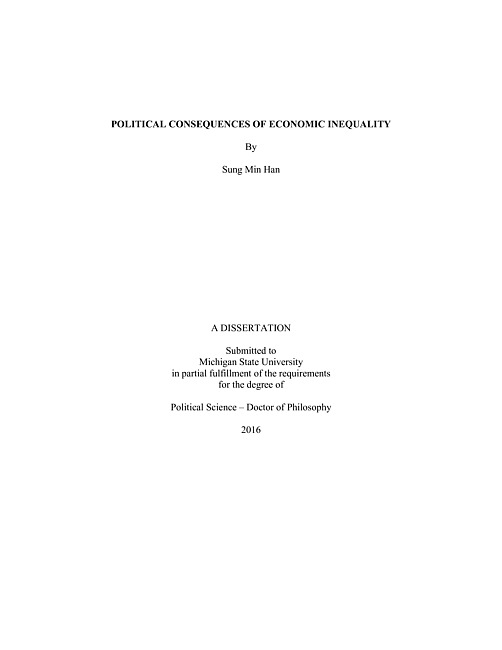Economic inequality has emerged a persistent topic in the popular press, academic circles, and election cycles. Indeed, mounds of evidence suggest the gap between the rich and the poor is not only growing in the United States, but also around the globe. While much research exists on the economic fallout of inequality, we have less understanding of the political repercussions of this expanding wealth gap. My dissertation, comprised of three main chapters, aims to address this lacuna and revise conventional wisdom by highlighting the consequences of economic inequality on our political systems and politics. In particular, I examine how economic inequality yields more extreme policy positions by political parties, how it fosters public discontent with democracy, and how it moves voters to prioritize redistributive issues. Each chapter features a clear micro-level model of how the rising economic inequality affects electoral incentives and redistributive preferences among party elites and voters. Together, they contribute to our understanding of how changes in economic inequality affect party-voter’s distributional linkage, redistributive attitudes, democratic processes, and democratic accountability.