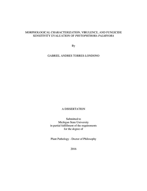 Phytophthora palmivora is restricting tropical plant pathogen for tropical and subtropical crops. Management of the pathogen has relied mostly on cultural practices and plant breeding; however, absence of these strategies in crops such as oil palm have resulted in catastrophic epidemics. During the present study a total of 150 isolates of P. palmivora obtained from 17 countries and 16 different hosts were studied. Differences in morphology, cultural growth, virulence and in-vitro and in-vivo response to nine fungicides, including the broadly used active ingredient mefenoxam, were elucidated. Differences in sporangia, chlamydospore and oospore measured parameters were observed among isolates; however, they ranged within those described for the species. Differences in sporangia length, sporangia breadth, and chlamydospore diameter seems to be influenced by the host family. This influence was not observed for the oospore characteristics. Virulence of isolates from Citrus spp. were also distinguishable from the rest of families when they were tested on apples; the lesion diameter of this isolates (31.9 mm) was about 10 millimeters shorter than the average of the rest of the families (41.7 mm). No significant differences were observed within the other families. Isolates from the Americas caused larger lesions than those from Asia and Oceania. Only one isolate of P. palmivora (13720) was intermediately sensitive to mefenoxam at 100 ppm.In order to identify possible active ingredients that could be used to manage diseases caused by P. palmivora, efficacy of the fungicides captan, cyazofamid, dimethomorph, fluopicolide, mandipropamid, mefenoxam, oxathiapiprolin, zoxamide, and potassium phosphite were tested on petunia bedding plants. Total control of the disease was observed at 21 days after inoculation with mefenoxam, captan and oxathiapiprolin. Success in disease control was followed by manidporpamid (83%), and fluopicolide and dimethomorph and zoxamide which presented an intermediate level of control (50%). The rest of the fungicides were not different from the inoculated control.With the exception of potassium phosphite, the in-vitro response to the selected fungicides was evaluated using the spiral plating technique. The effective concentration (EC50) for each isolate was elucidated by measuring the distance (mm) between the center of the plate and the point where 50% of lateral growth was observed. The data generated during the study were analyzed using the R-package ECX, developed during the present study. All products were effective in controlling most of the isolates at the selected ranges. Four isolates were not controlled with mefenoxam; however, the maximum dose of mefenoxam evaluated (0.289 mg/L) with the spiral plating technique does not implies resistance. The present study demonstrates the variability of the P. palmivora population, and provides some insight in its control using fungicides.