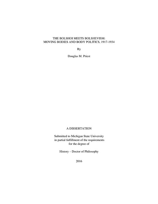 THE BOLSHOI MEETS BOLSHEVISM: MOVING BODIES AND BODY POLITICS, 1917-1934ByDouglas M. PriestFollowing the Russian Revolution in 1917, the historically aristocratic Bolshoi Ballet came face to face with Bolshevik politics for the first time. Examining the collision of this institution and its art with socialist politics through the analysis of archival documents, published material, and ballets themselves, this dissertation explains ballet’s persisting allure and cultural power in the early Soviet Union. The resulting negotiation of aesthetic and political values that played out in a discourse of and about bodies on the Bolshoi Theater’s stage and inside the studios of the Bolshoi’s Ballet School reveals Bolshevik uncertainty about the role of high culture in their new society and helped to define the contentious relationship between old and new in the 1920s. Furthermore, the most hostile attack on ballet coming from socialists, anti-formalism, paradoxically provided a rhetorical shield for classical ballet by silencing formalist critiques. Thus, the collision resulted not in one side “winning,” but rather in a contested environment in which dancers embodied both tradition and revolution. Finally, the persistence of classical ballet in the 1920s, particularly at the Ballet School, allowed for the Bolshoi Ballet’s eventual ascendancy to world-renowned ballet company following the second World War. This work illuminates the Bolshoi Ballet’s artistic work from 1917 to 1934, its place and importance in the context of early Soviet culture, and the art form’s cultural power in the Soviet Union.