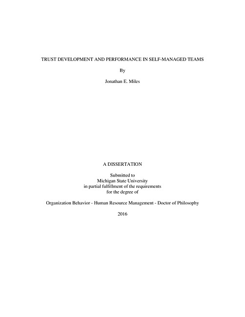 Research on teams has overwhelmingly presented trust (based on perceptions of the team’s ability, integrity, and benevolence) as a positive and required antecedent of team effectiveness, proposing that trust linkages make it possible for team members to better communicate and coordinate their efforts. This positive conceptualization of trust holds even for groups that have just formed and begun working together, as such groups develop trust in one another (based mainly on institutional, dispositional, and cognitive proxies for ability, integrity, and benevolence) rapidly in order to complete their goals together, referred to in the literature as swift trust. This dissertation proposes that high levels of trust early in team tenure can cause teams to lag behind in performance when compared to teams who build trust more slowly. In addition, this dissertation examines the reciprocal relationship between trust and performance over time, as performance episodes provide information on ability, integrity, and benevolence to the team. By observing and surveying a set of 96 teams working on a multiple-step project over the course of 15 weeks, I was able to determine that demographic similarity and trust propensity predict trust early in team tenure, and that teams with high levels of this early trust produced lower overall performance than did teams who built trust more slowly. I also found that the variance in contribution toward performance within the team negatively predicts subsequent trust in the team, and that trust predicts subsequent effectiveness of team processes. On the other hand, team performance does not predict subsequent trust in the team, indicating that team members may not use performance information as an indicator of the ability, integrity, and benevolence of their team. While high trust early in team tenure was detrimental to performance, trust late in team tenure allowed teams to better translate their past performance into high subsequent performance. I discuss the theoretical and practical implications of these findings and propose future research directions in the study of a more complex relationship between trust and performance in teams over time.
