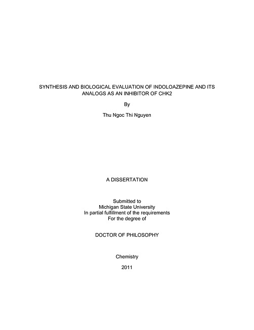 This dissertation is focused on two objectives. The first objective comprises the improvement of the synthesis of (Z)-5-(2-amino-4-oxo-1H-imidazol-5(4H)-ylidene)-2,3,4,5-tetrahydroazepino[3,4-b]indol-1(10H)-one, also referred to as indoloazepine. The second objective is to evaluate indoloazepine as a cellular inhibitor of checkpoint kinase 2 and its use as an adjuvant drug for cancer therapy. The first chapter identifies checkpoint kinase 2 (Chk2) as a viable adjuvant drug target for cancer therapies. The second chapter discusses the improvement in a previously reported synthesis of indoloazepine. The third chapter describes the biological evaluation and the cellular inhibition of Chk2 by indoloazepine. Finally, the fourth chapter describes the use of indoloazepine as a potential chemosensitizer via the nuclear factor-kappa B (NF-êB) pathway.DNA damage induced by ionizing radiation activates the ataxia telangiectasia mutated pathway, resulting in apoptosis or DNA repair. The serine/threonine checkpoint kinase, Chk2 is an important transducer of this DNA damage signaling pathway and mediates the ultimate fate of the cell. Chk2 is an advantageous target for the development of adjuvant drugs for cancer therapy; because inhibition of Chk2 allows normal cells to enter cell cycle arrest and carry out DNA repair, whereas many tumors bypass cell cycle checkpoints. Chk2 inhibitors may thus have a radioprotective affect on normal cells. Previously, our research group reported the synthesis of hymenialdisine-derived indoloazepine and its ability to inhibit the kinase activity of Chk2 using purified kinase. The previous synthesis of indoloazepine reported by the Tepe research group yielded indoloazepine in 12%. The synthetic route utilized steps that resulted in unstable intermediates that were difficult to isolate with the final step requiring purification twice by column chromatography. The improved synthesis reported here increased the overall yield to 30% utilizing a thiohydantoin derivative, which also facilitated the isolation of the indoloazepine. In addition, this route gave rise to new analogs of indoloazepine which were evaluated as inhibitors of Chk2.Indoloazepine was evaluated in cell culture and was found to be non-cytotoxic to cells. Indoloazepine increased survival in normal cells following IR-induced DNA damage, but not in tumor cells with mutated p53. Additionally, indoloazepine was directly inhibited Chk2 in cells by inhibition of cis-autophosphorylation of Ser516 of Chk2. Chk2 also plays a significant role in the inhibition of IR-induced G2 arrest. The data suggests that inhibition of Chk2 in normal cells protects cells exposed to IR as well as induce rapid progression into G1 so that cells initiate DNA repair following IR-induced DNA damage.