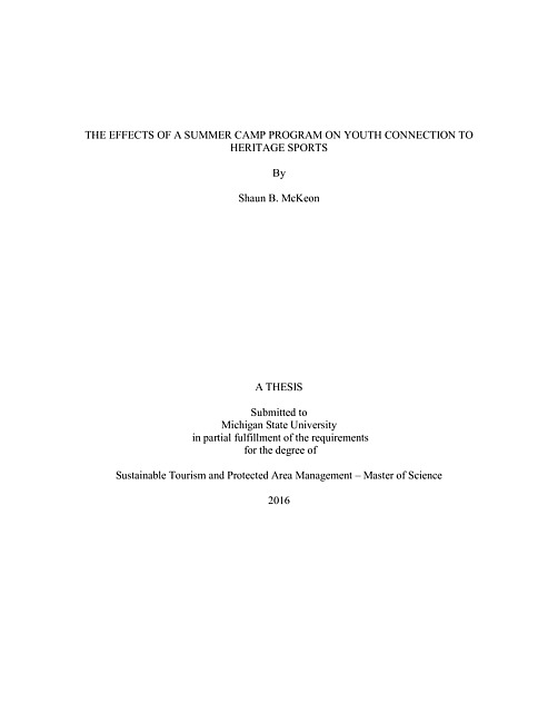 ABSTRACTTHE EFFECTS OF A SUMMER CAMP PROGRAM ON YOUTH CONNECTION TO HERITAGE SPORTSByShaun B. McKeon Historically speaking, Michigan has been a state with a long history of participation in outdoor heritage sports. Hunting, fishing, and trapping pursuits have helped to define what it means to be a Michigander. Over the last few generations, Michiganders have begun to move away from the traditional heritage sports, while other activities such as outdoor adventure recreation have seen an increase. The portion of the Michigan population with the least amount of exposure to heritage sport opportunities are youth. The purpose of this quantitative study was to determine the impacts of a conservation-focused residential summer camp on intended and actual behaviors of youth connection with heritage sports. This study used pre-camp, post-camp, and follow-up camp surveys covering youth behaviors over a period of 18 months. Using the theory of reasoned action and the theory of responsible environmental behavior as frameworks for measuring behavior change, I addressed the following question: Does participation in a conservation-focused youth camp program have an impact on increased connection to heritage sports? Measuring the changes in youth behavior has allowed for the camp program staff to evaluate whether the organizational goals are being met. The results of this study indicated an increase in hunting trips taken by camp participants. There were was also a significant increase in conservation knowledge gained by the campers.