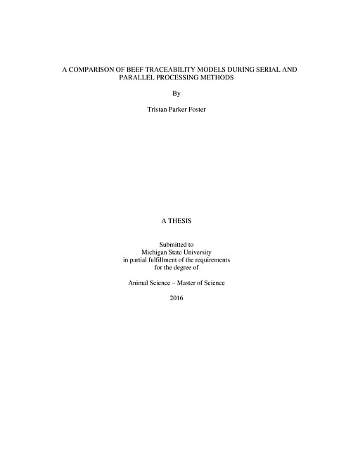 ABSTRACTA COMPARISON OF BEEF TRACEABILITY MODELS DURING SERIAL AND PARALLEL PROCESSINGByTristan Parker FosterTraceability of beef attributes through supply chains is a market barrier. Automatic identification and data capture technologies offer the feasibility of maintaining animal and product data through carcass fabrication. Individual animal identity of fifty-four (54) beef carcasses were maintained through the supply chain. Carcasses were fabricated into wholesale cuts using a serial processing method (SPM) or a parallel processing method (PPM). The goal of this study was to identify labeling techniques for two different processing methods, SPM and PPM, in tracking wholesale meat cuts back to the original animal in mid-sized processing facilities. The objectives of the study were 1) to determine the cost of additional labor required for traceability; 2) determine both consumable and fixed costs of traceability; 3) test traceability accuracy utilizing DNA matching.The mean number of in-process labels generated per carcass for SPM was 3.7 and for PPM was 30.9 (P < 0.01). The amount of time required for generating in-process labels for SPM (2 min 16 sec) was less than PPM (8 min 45 sec) (P = 0.01). The amount of time required to label each carcass was less (P < 0.01) for SPM (18 sec) than for PPM (3 min 10 sec) which required in-process labels. Total cost of traceability, including fixed and consumable cost per carcass, was nearly twice as much for PPM ($17.98) than SPM ($9.02). Traceability, for both processing methods, was found to have 100% fidelity, as verified using DNA marker genotyping.
