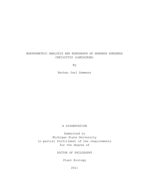 Monarda subgenus Cheilyctis (Lamiaceae) is a monophyletic group comprised of 16 species of annual and perennial herbs, subshrubs, and shrubs. It has a temperate North American distribution that extends from southern Canada, across much of the United States, into Mexico as far south as Michoacán. The group is most easily characterized by strongly arching upper corolla lips, inserted stamens, and verticillate glomerules. A multivariate morphometric analysis was performed to assess species circumscriptions. Fifty morphological characters were measured from 386 herbarium specimens. Gower's similarity coefficient was used to perform unweighted pair-group method using arithmetic averages (UPGMA) and principal coordinates analysis (PCOA). The results revealed 11 distinct clusters that correspond to previously accepted species (M. austromontana, M. citriodora, M. clinopodioides, M. fruticulosa, M. humilis, M. maritima, M. mexicana, M. pectinata, M. punctata, M. stanfieldii, and M. viridissima) and five clusters that represent new species or combinations (see below). Boxplots of the data elucidate the characters important to the circumscription of the species. A monograph of this group, including a morphological cladistic analysis, is also presented. Sections covering taxonomic history, morphology, phylogeny, and taxonomy, as well as a key to the species of the subgenus are provided. In addition to a full synonymy and description, phenology, distribution, a specimen image, and a list of representative specimens is also provided for each species. Two species are described (Monarda n. sp. 1, Monarda n. sp. 2), and three new combinations are proposed (M. arkansana ined., M. occidentalis ined., M. villicaulis, ined.)